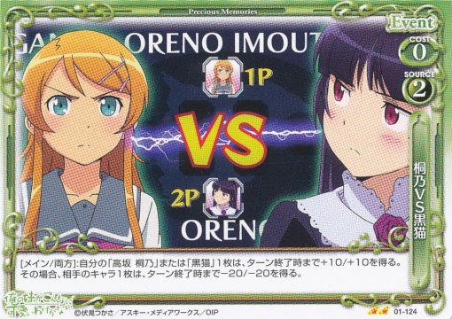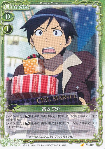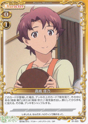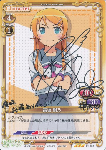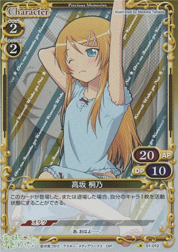 アクティブ持ち。自分のキャラが出るたびに、自分のキャラを活動状態にできるので、強化京介を起こして、桐乃のAP・DPを両方上げることができたり、相手ターン中に自由登場京介を出して、相手のアタッカーを止めつつ、SR5コスト桐乃を起こすことも可能。ソース桐乃で手軽に出せます。