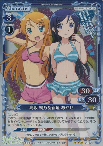 桐乃デッキ専用のキャラ展開補助カード。ソース桐乃で制服コンビを出して、ソース桐乃を回収→ソース桐乃で水着コンビを出して「桐乃とゆかいな仲間たち」をサーチとかできると超強力。先ほどの沙織や黒猫と組み合わせることで、先攻1ターン目から「桐乃とゆかいな仲間たち」を使うことも可能です。