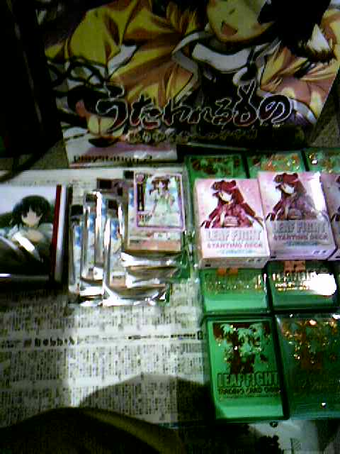 予定では、頼まれたもの(壁サークル3つ含む)だけで終わると思っていたのですが、わずか20分でひととおり全部買えてしまったので、企業ブースも回ってきました。リーフファイトも難なく買え、イルファのLカードも7枚Get。次に、リーフのブースで紙袋セットやアレンジCDを買い、タマ姉のカードがあるからといった理由だけでLyceeのコミケ限定パックを買ったりなどしました。(結局タマ姉は、でなかった。トレードしてくれる優しい人いないかなぁ)